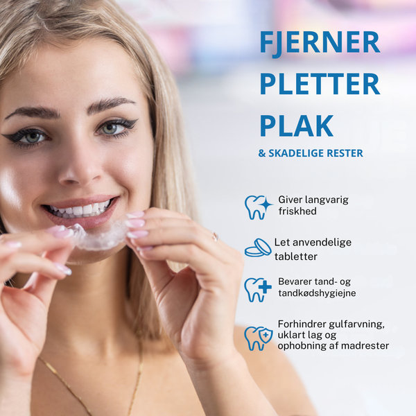 Med vores rengøringstabletter hører dette problem fortiden til. De opløses hurtigt og nedbryder pletterne, så dine retainere igen ser strålende ud.