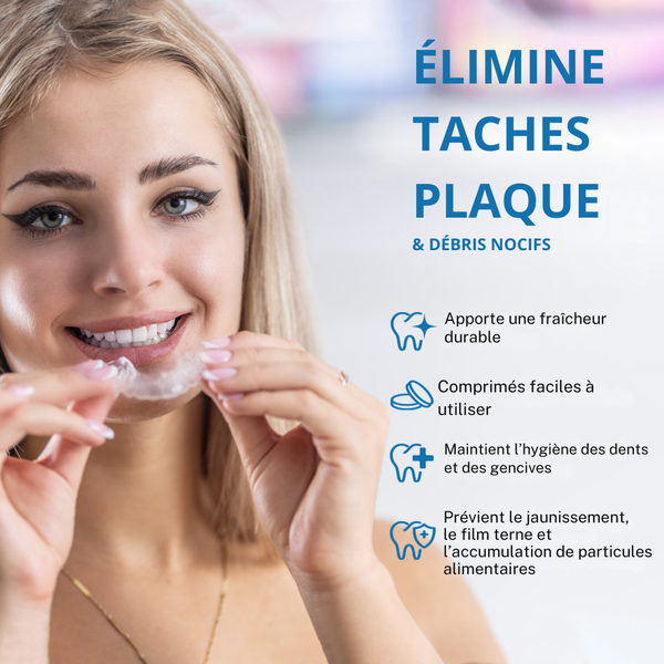 Mes dents sont plus propres et plus éclatantes. Les comprimés agissent rapidement et efficacement. 😊