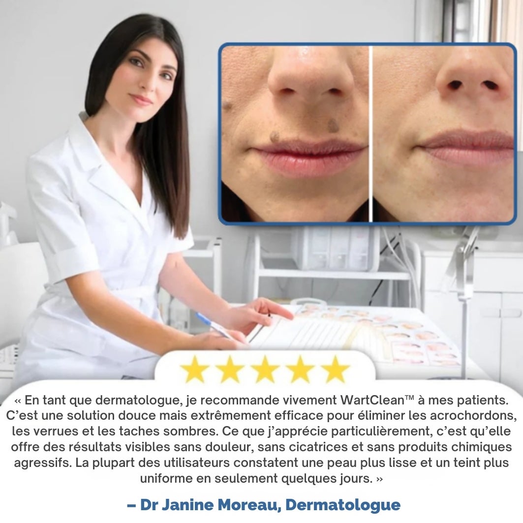 Les meilleurs spécialistes de la peau font confiance à WartClean™ pour sa formule cliniquement prouvée, alimentée par l'extrait de Thuja – une plante naturelle, utilisée depuis des siècles pour son incroyable capacité à traiter les excroissances cutanées tenaces. Là où d'autres traitements échouent, WartClean™ pénètre profondément pour traiter la cause racine, offrant des résultats rapides et durables sans douleur ni cicatrices.